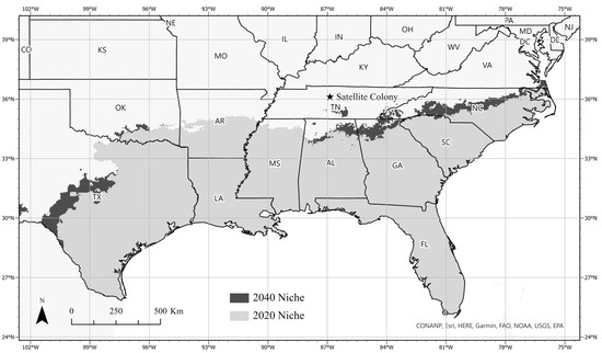 Our results also indicate a strong likelihood that E. rosea has significant potential for continued geographic spread. However, the region where our satellite population has become established does not appear to be one of them. We suspect that this unique satellite population in Nashville, TN, will not persist indefinitely without anthropogenic influence. Human interventions such as supplemental irrigation during dryer seasons and poor home insulation may be artificially sustaining this satellite population. However, there are several regions where our model indicated that the habitat and environmental conditions are suitable for E. rosea outside of its current realized niche. Specifically, it seems likely that expansion will occur beyond its current range in the next two decades, which is centered on southern and coastal states of the U.S. (Figure 1), and will begin to penetrate more deeply into Texas, Alabama, Georgia, and Virginia, as well as isolated regions in central Tennessee (Figure 3 and Figure 4).