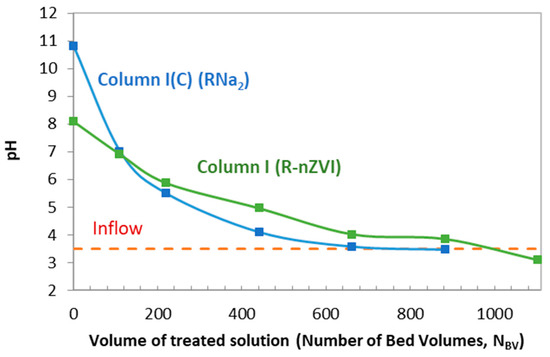As seen in Figure 3, the initial pH of simple RNa2 was 10.8. and that of R-nZVI was 8.09. During the operation, the pH dropped to value 3.5 of the feed solution after the treatment with 660 BVs of solution in the control column I(C), and after 1000 BVs of solution in the R-nZVI column I.