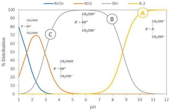The chelating resins with IDA functional groups have three protonated forms, RH3+, RH2 and RH−. The values of the protonation constants, as determined by Szabadka (1982), are the following: logK1 = 9.12, logK2 = 3.1, logK3 = 1.44 [17]. These values were incorporated in the database of VMinteq software and were used for calculating the distribution of protonated forms as a function of pH (Figure 4).