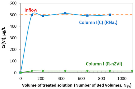 The performances of simple resin RNa2 and nanocomposite R-nZVI for the removal of Cr(VI) are compared in Figure 5. As seen in the figure, the concentration of Cr(VI) in the effluents of the control column I(C) was similar to the concentration in the feed solution, i.e., 500 μg/L, during the whole operation of the column, which lasted for 5 days and corresponded to the treatment with 884 BV. This indicates that the simple resin RNa2 is not able to remove the hexavalent chromium. On the contrary, the nanocomposite material R-nZVI was very efficient in removing Cr(VI). For the same duration of treatment, the concentration of Cr(VI) remained constantly below detection limit in the effluents of column I.