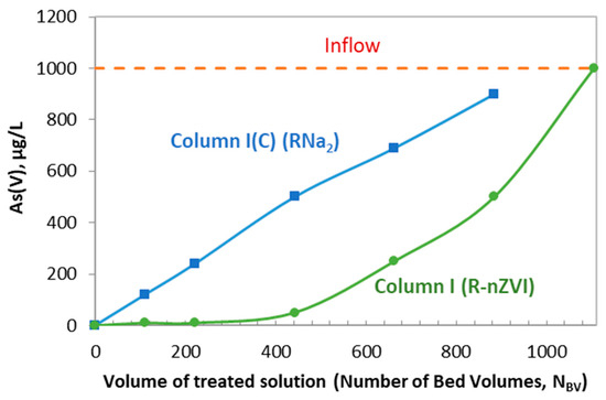 Column I filled with the nanocomposite R-nZVI was more efficient in retaining As(V) in comparison with the control column. Arsenic was detected in the effluents after the treatment of a solution volume equivalent to 400 BVs. The amount of As retained by the nanocomposite material was equal to 0.6 mg/g.