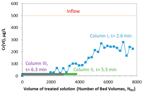 In the short column (I), where the contact time was 2.6 min, the Cr(VI) was detected in the effluents after the treatment with 2000 BVs. Between 2000 and 5500 BVs, there was a gradual increase of Cr(VI) concentration, For the rest of the operation, Cr(VI) remained quasi-constant, close to 250 μg/L. This is an indication that there is a kinetic limitation to the removal of Cr(VI). Previous studies have shown that the reduction of Cr(VI) by similar nanocomposite materials follows a first order kinetics with respect to the concentration of Cr(VI) [5,20]. In this case, the inflow, Cin, and effluent, Cef, concentrations depend on contact time, according to Equation (4):