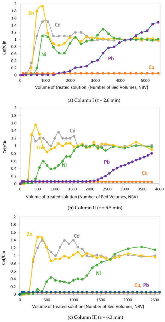 The removal of cationic contaminants in the three columns filled with R-nZVI is shown in Figure 8. The results are presented as the ratio Cef/Cin versus the volume of treated solution, where Cef is the concentration of each element in the effluents and Cin the concentration in the feed solution.