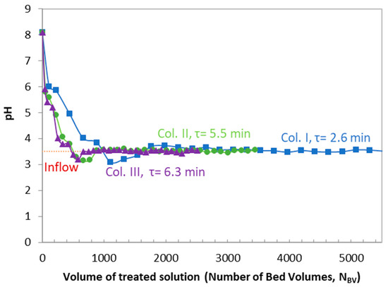 The evolution of pH in the effluents of the three columns is presented in Figure 9. It can be observed that the pH values of the effluents were around 3.5 after 500BVs of treated solution.