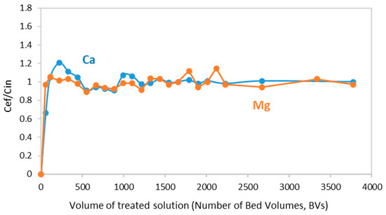 The feed solution contained Ca+2 and Mg+2 at higher levels in comparison with the contaminants. Namely, the concentrations of Ca and Mg were 106 and 34 mg/L, respectively, while the levels of metal contaminants ranged between 0.1 mg/L for Cd and 20 mg/L for Zn. The ratio Cef:Cin for Ca and Mg in the effluents of column II is shown in Figure 10. The two elements were initially retained in the resin, but they were rapidly displaced by the protons and by the other cations exhibiting higher affinity for the iminodiacetic groups. A similar trend was observed in the other two columns.