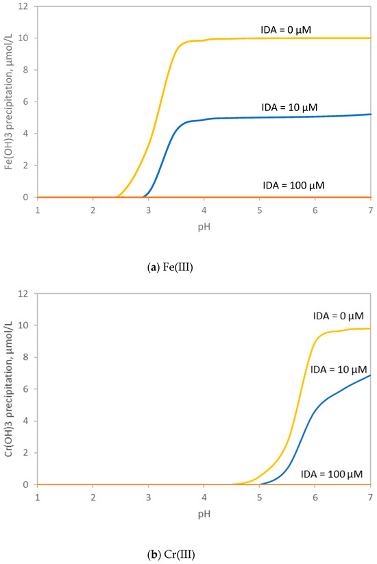 The effect of iminodiacetic acid ligands on the precipitation of Fe(III) and Cr(III) hydroxides is shown in Figure 11. The diagrams present the amount of precipitated Fe(OH)3 and Cr(OH)3, as a function of pH, from solutions containing 10 μΜ Fe(III) or Cr(III) and various concentrations of iminodiacetic acid (IDA) 0, 10 and 100 μΜ. Calculations were carried out using the software Visual Minteq V3.2. Formation constants for Fe(III)-IDA chelates and for Cr(III)-IDA chelates were obtained from the bibliography and are given in the Supplementary Material (Table S1) [21,22]. As seen in Figure 11a, in the absence of IDA, precipitation of Fe(OH)3 starts at pH 2.5 and is complete at pH > 4. In the presence of IDA at equimolar concentration with Fe of 10 μΜ, precipitation starts at pH 3 and when the pH increases only above 50% of the Fe precipitates. When IDA is present in excess, at 100 μΜ, all Fe(III) remains in solution. A similar trend is observed for Cr(OH)3 in Figure 11b. The main difference is that precipitation of the hydroxide starts close to pH 4.5 without IDA and pH 5.0 with 10 μM IDA. Based on above calculations, it is estimated that the trivalent cations, Fe(III) and Cr(III), which were produced from the reduction of hexavalent chromium by the nanoiron, were probably retained by chelation in the iminodiacetic acid functional groups of the resin.
