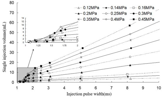 The variation in the injector flow rate with the injection pulse width at different injection pressures.