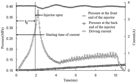 The response characteristics of the hydrogen injector are shown in Figure 3. It shows the driving current signal during hydrogen injection. The hydrogen pressure changes in the hydrogen supply pipeline at the front end of the injector, and the hydrogen pressure changes at the back end of the injector when the injection pressure is 0.4 MPa and the injection pulse width is 10 ms. As the injector driving current gradually increases from 0 to about 4 A, the injector is turned on at t0 time, and the hydrogen pressure at the front of the injector decreases rapidly. At the same time, the driving current is reduced to 1 A to keep the injector fully open. With the end of the hydrogen injection process, the injector driving current gradually decreases to 0, the injector is gradually closed at this time, and the hydrogen injection process ends.