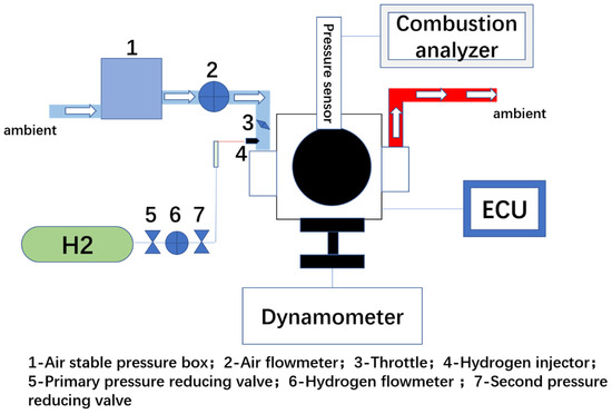 Figure 5 shows a schematic diagram of the engine test bench. During the experiment, a 15 MPa hydrogen tank was used to provide hydrogen. The purity of the hydrogen is 99.99%. After the hydrogen passes through the primary pressure reducing valve and the secondary pressure reducing valve, the pressure is reduced to 3.5 MPa to avoid damage to the injector. The dynamometer of the test bench is Power-Link’s GW10 (Xiangyi and Changsha, China), which is used to measure the engine power and torque. The control system of the engine bench is the FC2000 engine measurement and control system (Xiangyi and Changsha, China).