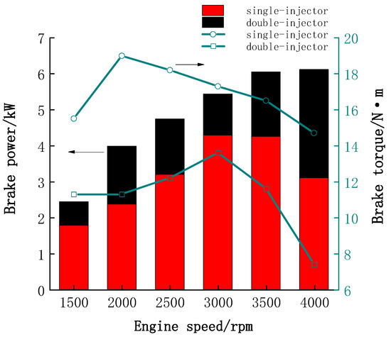 Furthermore, the minimum and maximum torque of the single-injector condition are 7.4 N·m and 13.6 N·m, respectively. In contrast, under the double-injector condition, the minimum torque is 14.5 N·m and the maximum torque is 19.0 N·m. Therefore, the engine torque characteristics at the double-injector are better than those at the single-injector.