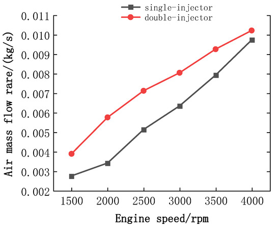 Figure 7 shows the comparison of the air mass flow rate of the single-injector and double-injector at different speeds. It can be seen that as the speed increases, the air mass flow rate continues to increase, because as the speed increases, the engine’s air intake increases per unit time. In addition, the air mass flow rate in the double-injector condition is significantly greater than that in the single-injector condition. The maximum air mass flow rate in the single-injector and double-injector working conditions is 0.0092 kg/s and 0.0102 kg/s, respectively. Hydrogen “clogs” the intake manifold, making the air mass flow rate from the single-injector smaller than that with the double-injector configuration. There are several reasons for the phenomenon of “blockage”: first, the molecular mass of hydrogen is very small, hydrogen is a gas, and the hydrogen expands rapidly after being injected into the intake manifold, resulting in a decrease in the effective circulation area of the air, which reduces the intake air mass; second, the pulse width of the hydrogen injection is a specific period of time, generally a few milliseconds, during which the hydrogen is continuously injected into the intake manifold and stays in the intake manifold. As a result, the “blockage” effect of hydrogen affects the air flow in the intake duct. However, under the condition of a double-injector, the hydrogen injection time is greatly shortened, the residence time of hydrogen in the intake manifold is shortened, and the “blockage” effect of hydrogen is significantly reduced, so the air mass flow into the cylinder is larger.
