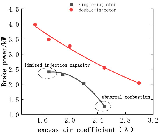 Gao, Jianbing [37], and Bifen Wu [38] pointed out that the PFI hydrogen internal combustion engine will cause the backfire phenomenon and reduce the engine performance at the same time. Similarly, the phenomenon of backfire also occurred during the experiment. Figure 8 shows a comparison of the excess air coefficient at 2000 rpm for the single-injector and double-injector. From the figure, it can be seen that the λ change range of the single-injector configuration is 1.70~2.47. However, the excess air coefficient of the double-injector condition has a larger variation range, which is 1.49~2.97. Furthermore, when the excess air coefficient is equal, the power of the double-injector condition is greater than the power of the single-injector condition. Because of the limited injection capacity of the single-injector, the amount of hydrogen injection is small. Thus, the power of the single-injector working condition is less than that of the double-injector condition. Limited by the insufficient injection capacity of the single-injector, the λ minimum value is 1.70. Therefore, it can be known that the injection boundary of the double-injector is larger than that of the single-injector. In addition, under the single-injector condition, when the excess air coefficient reaches around 2.5, the engine vibrates due to the unstable combustion. Limited by abnormal combustion, the mixture cannot be too lean, so λ cannot continue to increase. In contrast, the combustion is relatively stable under the double-injector condition. So, the excess air coefficient λ can be increased to 2.97. This is because the intake manifold is blocked by hydrogen under the single-injector conditions, which worsens the scavenging process. Consequently, there is less fresh air entering the cylinder, so there is more residual exhaust gas in the cylinder, which increases the likelihood of abnormal combustion. Therefore, the lean combustion boundary of the double-injector is also greater than that of the single-injector condition.