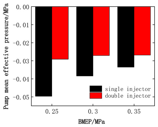 Figure 9 shows a comparison chart of the PMEP. As can be seen from the figure, the PMEP of both the single-injector and double-injector is negative, and the PMEP of the double-injector is smaller than that of the single-injector.