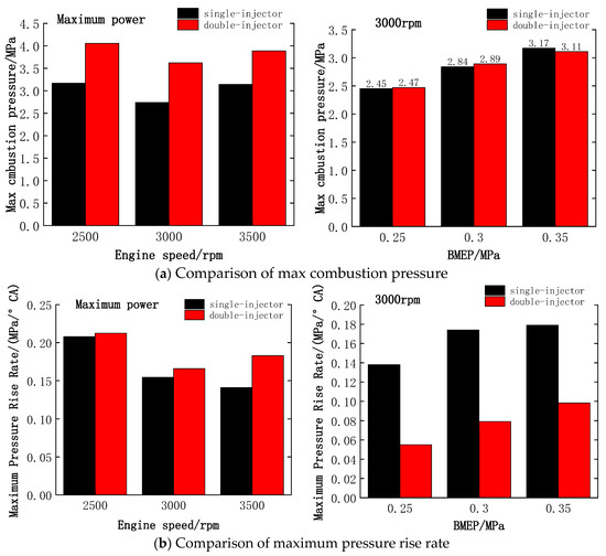 Figure 11a shows the max combustion pressure and Figure 11b shows the maximum pressure rise rate of the single-injector and double-injector under different working conditions. From Figure 11a, it is obvious that under different working conditions, the maximum combustion pressure of the double-injector configuration is almost greater than that of the single-injector setup. From the diagram, we can see that at the maximum power point of 2500 rpm, the maximum combustion pressures of the single-injector and double-injector working conditions are 3.17 MPa and 4.06 MPa, respectively. At the BMEP of 0.25 MPa, the maximum combustion pressures of the single-injector and double-injector are 2.45 MPa and 2.47 MPa. Because in the double-injector configuration, the air intake volume is larger, there is more working fluid, so the maximum combustion pressure is correspondingly larger.