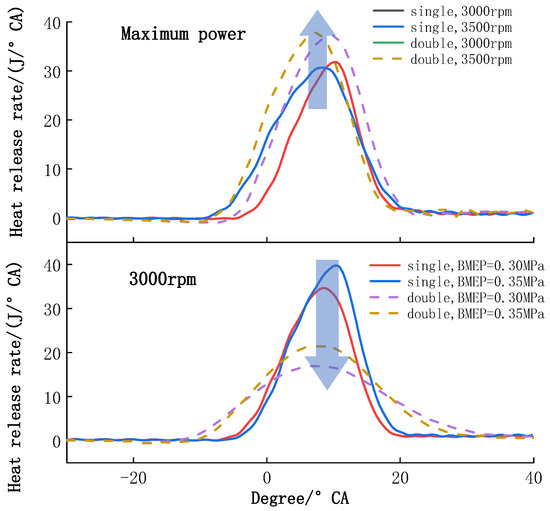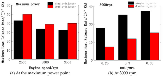 Figure 13 shows a comparison of the maximum heat release rate of the single-injector and double-injector configurations. From Figure 13a, at the maximum power point of 2500 rpm, the maximum heat release rates of the single-injector and double-injector configurations are 42.90 J/°CA and 49.85 J/°CA, respectively. The principle is similar to the analysis in the previous paragraph. On the contrary, from Figure 13b, when the BMEP is 0.30 MPa, the maximum heat release rates of the single-injector and double-injector are 37.72 J/°CA and 17.88 J/°CA, respectively. As previously explained in Section 2.1, when reaching the same load condition, the excess air coefficient of the double-injector condition is larger. It means that more air in the mixture does not participate in the reaction. Therefore, compared with the single-injector condition, the concentration of the mixture in the double-injector condition is lower, and the propagation speed of the flame is reduced. The heat release rate of the double-injector condition is smaller than that of the single-injector condition. However, it is worth noting that a large pressure rise rate and heat release rate will increase the deflagration tendency of the engine.
