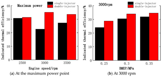 Figure 14 is the indicated thermal efficiency comparison of the single-injector and double-injector. From Figure 14a, at the maximum power point of 3000 rpm, the ITE of the single-injector and double-injector is 22.69% and 35.12%, respectively. From Figure 14b, at a BMEP of 0.30 MPa, the ITE of the single-injector and double-injector is 30.45% and 34.01%, respectively. Notably, the ITE of the double-injector is greater than that of the single-injector configuration. The main reasons are as follows. First of all, the double-injector has a shorter fuel injection duration. So, the hydrogen–air mixing time is longer, the mixture uniformity is better, and the combustion is more stable. Second, due to the greater instantaneous heat release rate of the single-injector condition, the heat transfer loss is increased. Furthermore, the pumping loss is smaller in the double-injector configuration. In summary, compared to the single-injector configuration, the ITE of the double-injector is higher.