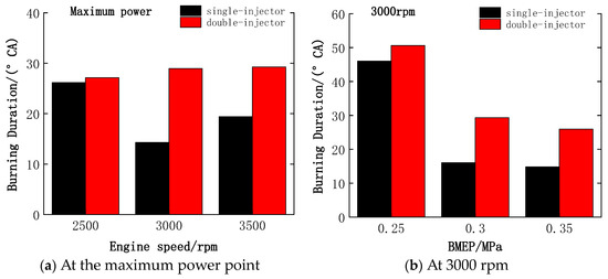 Figure 15 is a comparative chart of the burning duration between the single-injector and double-injector. As shown in Figure 15a, at 2500 rpm, the burning duration of the single-injector and double-injector is 26.19 °CA and 27.15 °CA, respectively. At the maximum power point, the burning duration of the double-injector is greater than that of the single-injector. Because the double-injector configuration has more of the air–fuel mixture in the cylinder, it leads to an increase in the burning duration. In addition, it can be seen that under the same load conditions, the burning duration of the double-injector is also longer than that of the single-injector. As depicted in Figure 15b, at a BMEP of 0.30 MPa, the burning duration of the single-injector and double-injector is 16.04 °CA and 29.35 °CA, respectively. The reasons for this phenomenon are as follows. Under the single-injector condition, the blocking phenomenon of hydrogen gas on the intake manifold is more obvious, and it takes longer for hydrogen to enter the cylinder. When the intake valve is closed, the concentration of hydrogen near the spark plug is higher, so the mixture burns faster after the spark ignition. Conversely, the excess air coefficient of the double-injector condition is larger, and the burning rate is slower. Correspondingly, the burning duration is longer.