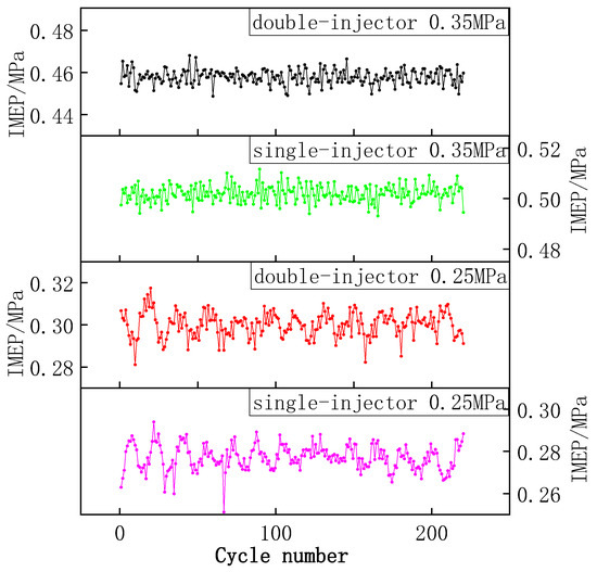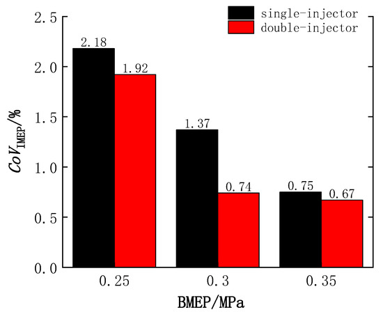 In order to compare the influence of a single-injector and double-injector on the CoVIMEP, the experimental conditions were set at 3000 rpm, the BMEP was set to 0.25~0.35 MPa, and the ignition timing was the maximum brake torque (MBT) ignition timing. As shown in Figure 16, it can be seen that under the same load, the IMEP fluctuation of the single-injector condition is larger than that of the double-injector, and the fluctuation of IMEP becomes smaller with the increase in the load. Figure 17 illustrates the characteristic curve of the CoVIMEP with the load. Notably, it can be found that the CoVIMEP of the single-injector working condition is greater than that of the double-injector condition.