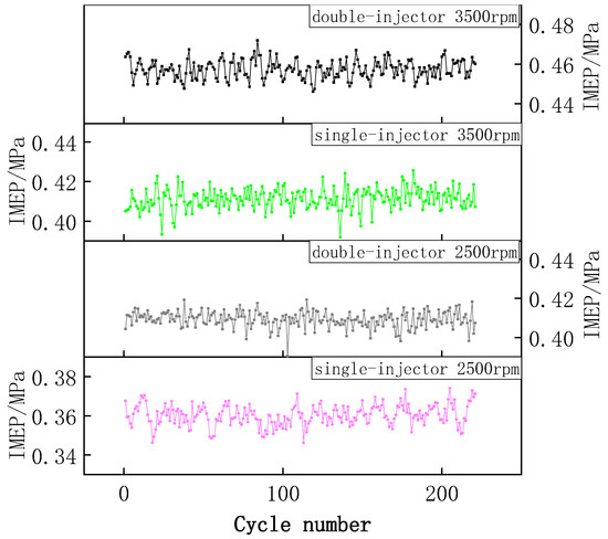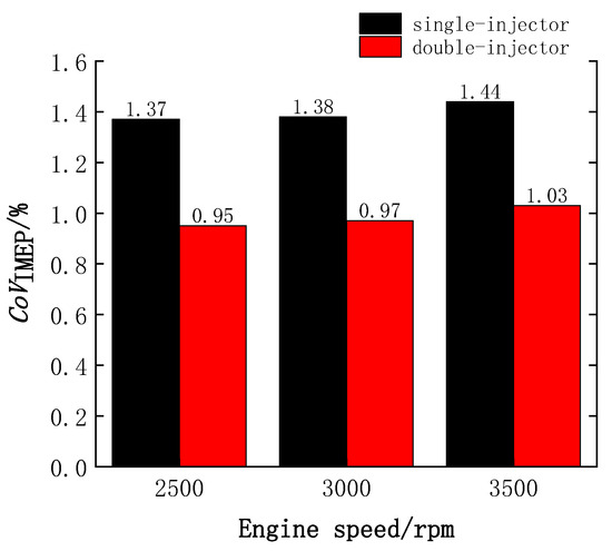 As shown in Figure 18, the effects of the single-injector and double-injector on the IMEP fluctuation at different speeds were comparatively studied. In Figure 19, the characteristic curve of CoVIMEP concerning the engine speed is presented. The selected working condition is 2500~3500 rpm, the BMEP is 0.3 MPa, and the ignition timing is MBT ignition timing.