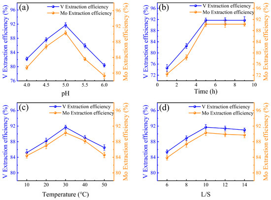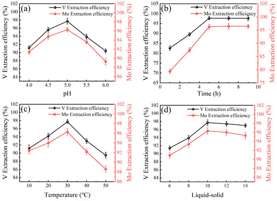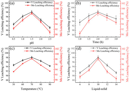 Influences of (a) pH, (b) time, (c) temperature and (d) liquid-solid ratio on the leaching efficiencies of V and Mo.