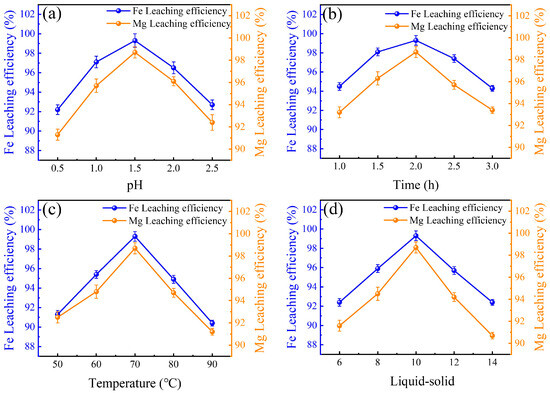 Influences of (a) pH, (b) time, (c) temperature, and (d) liquid-solid ratio on the leaching efficiencies of Fe and Mg.