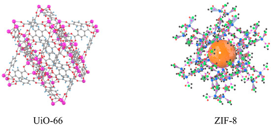 In the ZIF-8 adsorption system, the extraction efficiencies of V and Mo were influenced by pH, extraction time, temperature, and liquid-solid ratio. The optimal pH for both V and Mo extractions was 5.0, as the efficiency increased at this pH but decreased at pH 6.0. ZIF-8, serving as a metal-organic framework, exhibits optimal adsorption under weak acidic or weak alkaline conditions [44]. The extraction efficiency of V rose from 82.2% to 91.7%, and Mo extraction efficiency increased from 81.4% to 90.3% at this optimal pH. The extraction efficiency improved with time, peaking at 5.0 h for both V and Mo. V extraction efficiency increased from 74.6% to 91.7%, and Mo extraction efficiency from 72.4% to 90.3% within this time frame. No significant improvement was observed when the extraction time was extended to 9.0 h. Temperature also played a crucial role, with the highest extraction efficiencies for both V and Mo occurring at 30 °C [45]. Above this temperature, the efficiency decreased, indicating that excessively high temperatures lead to complex decomposition. The liquid-solid ratio impacted extraction efficiency as well. The optimal ratio was determined to be 10.0, as increasing the ratio beyond this point led to a decrease in extraction efficiency for both V and Mo. Overall, the UiO-66 adsorption system was found to be more efficient than ZIF-8 in the extraction of V and Mo. UiO-66 has a wider pore structure and greater adsorption capacity, which is more suitable for the adsorption of metal macromolecular structures. The structural differences between UiO-66 and ZIF-8 affect their ion adsorption capacity, as shown in Figure 6.