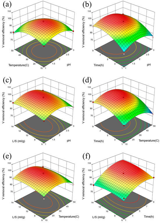 Response surface diagram of V extraction efficiency for (a) temperature and pH, (b) time and pH, (c) liquid-solid ratio and pH, (d) time and temperature, (e). liquid-solid ratio and temperature, and (f). liquid-solid ratio and time.