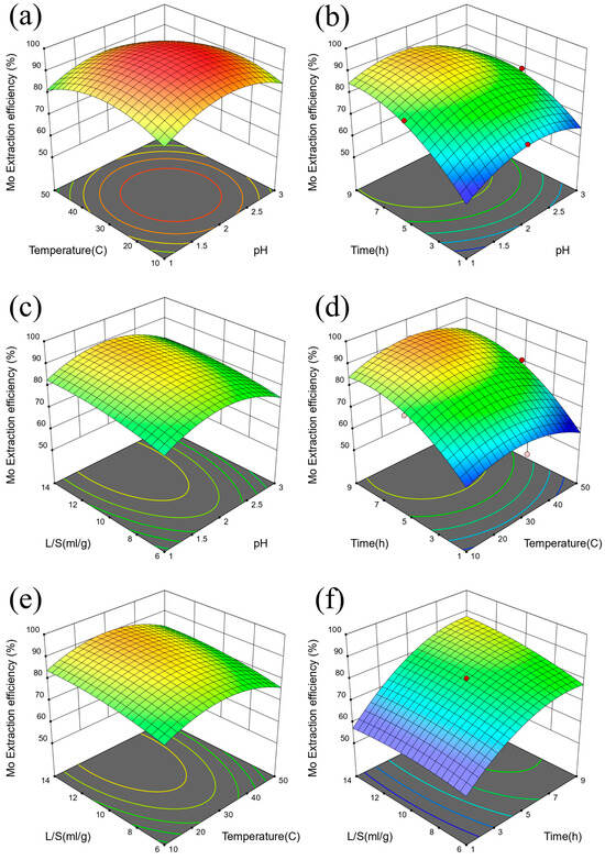 Response surface diagram of Mo extraction efficiency for (a) temperature and pH, (b) time and pH, (c) liquid-solid ratio and pH, (d) time and temperature, (e). liquid-solid ratio and temperature, and (f). liquid-solid ratio and time.