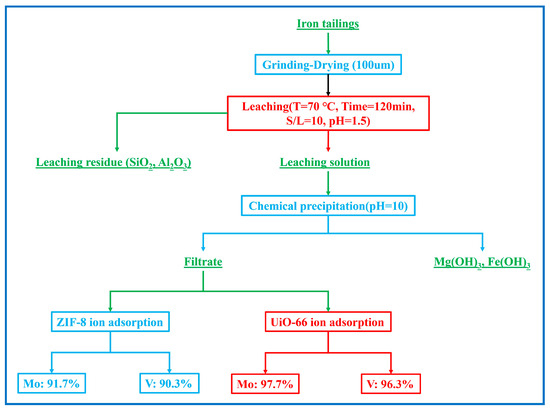 In this study, the method of acid leaching, MOF adsorption, and chemical precipitation was adopted to recover V, Mo, Fe, and Mg from iron tailings (Figure 9) [56]. XRF testing for leaching residue is shown in Table 7. According to the results in Table 7, SiO2 dominated the leaching residue, and the remaining elements were less than 5%. The leached residue was almost non-toxic and could be used as a building material. The whole process had low energy consumption, low equipment requirements, and significant recovery efficiency, which was in line with the national policy of sustainable development of resource exploitation and utilization [57]. It provided a new idea for the follow-up research.