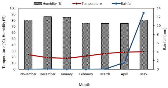 Temperature, humidity, and precipitation distributions at the experiment location on a monthly basis from 2020–2021.