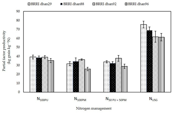 Partial factor productivity of boro rice under different nitrogen management. N0 = No N (nitrogen); N100PU = 100% of the RD (recommended dose) of N from urea (300 kg per ha); N100PM = 100% of the RD (recommended dose) of N (nitrogen) from poultry manure (14.5 t ha−1); N50PU+50PM = 50% of the RD (recommended dose) of N (nitrogen) from urea (150 kg per ha) + 50% of the RD (recommended dose) of N (nitrogen) from poultry manure (7.25 t ha−1); NUSG = 100% of RD (recommended dose) of the N from USG (2.7 g).