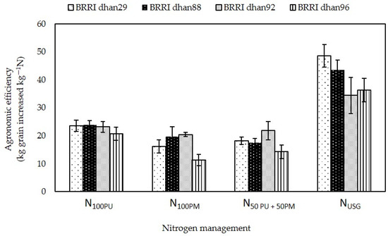 Agronomic efficiency of boro rice under different nitrogen management. N0 = No N (nitrogen); N100PU = 100% of the RD (recommended dose) of N from urea (300 kg per ha); N100PM = 100% of the RD (recommended dose) of N (nitrogen) from poultry manure (14.5 t ha−1); N50PU+50PM = 50% of the RD (recommended dose) of N (nitrogen) from urea (150 kg per ha) + 50% of the RD (recommended dose) of N (nitrogen) from poultry manure (7.25 t ha−1); NUSG = 100% of RD (recommended dose) of the N from USG (2.7 g).