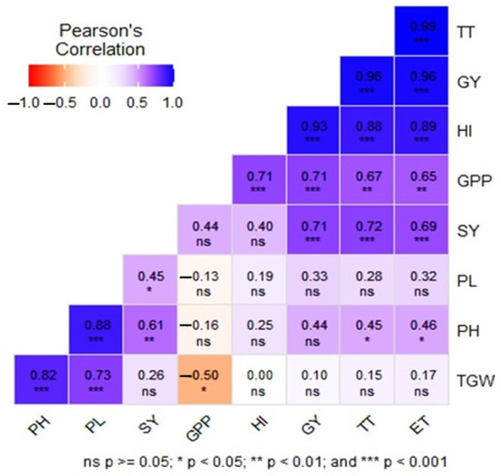 In Figure 4, we can see the correlation matrix of the measured traits, which lets us see how they are linked. PH showed a significant and positive correlation with TT, ET, PL, TGW, and SY, while it showed non-significant positive correlation with GY and HI and non-significant negative correlation with GPP. The relationship among TT, ET, GPP, GY, SY, and HI was also significant and positive but also showed non-significant positive correlation with PL and TGW. At the same time, ET had very strong correlation with GY and HI and moderate correlation with GPP and SY but non-significant correlation with PL and TGW. GPP had positive correlation with GY and HI but non-significant negative correlation with PH, PL and TGW. TGW had only significant positive correlation with PH and PL. GY is strongly correlated with TT, ET, GPP, SY, and SY but non-significant with PH, PL and TGW. SY showed significant positive correlation with PH, PL, TT, ET and GY. Finally, HI had significant correlation with TT, ET, GPP and GY.
