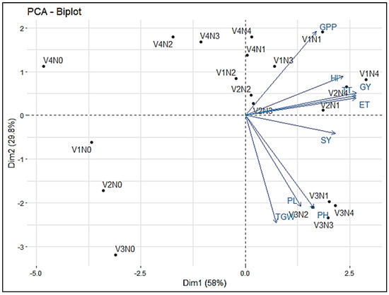 Principal component analysis (PCA). Here, N0 = No N (nitrogen); N100PU = 100% of the RD (recommended dose) of N from urea (300 kg per ha); N100PM = 100% of the RD (recommended dose) of N (nitrogen) from poultry manure (14.5 t ha−1); N50PU+50PM = 50% of the RD (recommended dose) of N (nitrogen) from urea (150 kg per ha) + 50% of the RD (recommended dose) of N (nitrogen) from poultry manure (7.25 t ha−1); NUSG = 100% of RD (recommended dose) of the N from USG (2.7 g), HI = Harvest index, SY = Straw yield, GY = Grain yield, TGW = 1000-grain weight, GP = grains panicle−1, PL = Panicle length, ET = Effective tillers hill−1, TT = Total tillers hill−1, PH = Plant height, V1 = BRRI dhan29, V2 = BRRI dhan88, V3 = BRRI dhan92, V4 = BRRI dhan96.