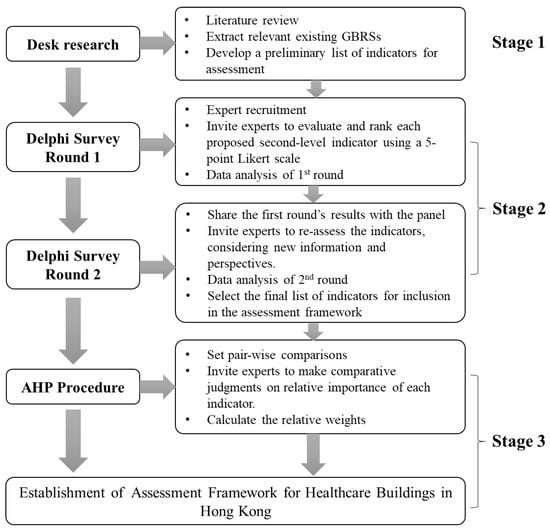 The methodology adopted for this study is delineated into three stages, each integral to the development of a comprehensive assessment framework. The initial stage involved desk research, aimed at generating a preliminary list of indicators. This was followed by the Delphi survey, where a panel of experts was engaged to appraise the draft scoring criteria and to contribute recommendations. The final stage utilized the Analytic Hierarchy Process (AHP) to determine the weighting ratios of the indicators. The overview of the process is presented in Figure 1.