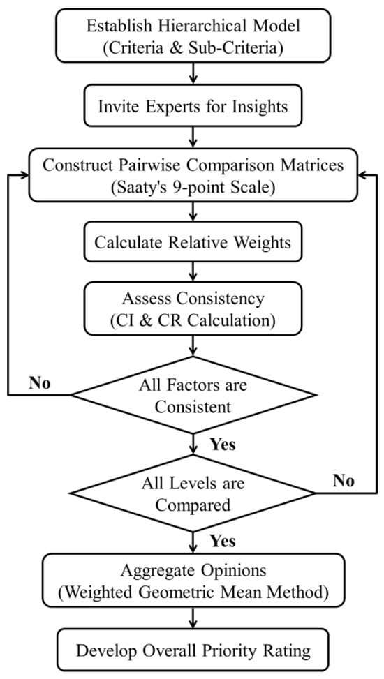 With the indicators thus validated, the Analytic Hierarchy Process (AHP) was employed to derive the weights of various criteria for green building evaluation in this study []. Figure 3 illustrates the step-by-step methodology employed in the AHP process, from the initial establishment of criteria to the final computation of weights.