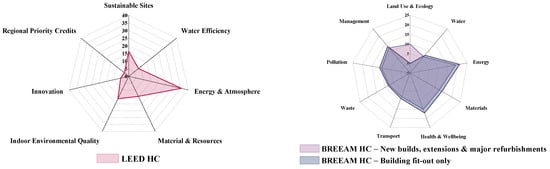 Several studies have examined the application of GBRSs to healthcare facilities. For instance, existing GBRSs such as the Leadership in Energy and Environmental Design (LEED) in the United States and the Building Research Establishment Environmental Assessment Method (BREEAM) in the UK have been adapted to include healthcare-specific versions [,]. These adaptations have introduced criteria that address the peculiarities of healthcare buildings, such as indoor air quality and patient comfort, which have profound implications for patient recovery and staff wellbeing [,]. Comparative studies, such as those by Castro et al. [,], have delineated and compared the main building sustainability assessment methods specific to healthcare facilities. These studies suggest that while there is a general alignment on the broad principles of sustainability, substantial variation exists in how different systems prioritize and evaluate specific criteria.