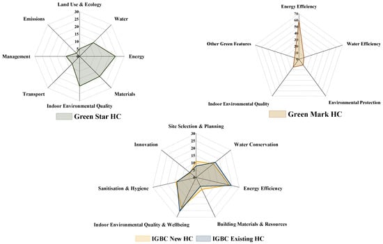 In the realm of sustainable healthcare building assessment, five major Green Building Rating Systems (GBRSs)—LEED, BREEAM, Green Star, Green Mark, and IGBC—emerge as noteworthy contributors, each with distinct methodologies and priorities. While all five systems share a broad commitment to advancing sustainability and wellness, the weighting they assign to various assessment criteria elucidates the diverging emphases that characterize their approaches. Figure 4 shows the major indicators in the five GBRSs studied.