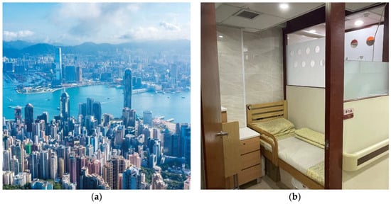 Before delving into the specifics of the proposed assessment framework, it is essential to understand the unique urban context of Hong Kong. As a densely populated metropolis, Hong Kong is marked by its high-rise architecture and compact urban layout (Figure 5a). Despite Hong Kong’s status as a developed economy, it is characterized by significant wealth disparity, which profoundly affects various aspects of societal life, particularly the living conditions in nursing homes. Many of these facilities, catering to the less affluent segments of the aging population, face the challenge of providing adequate care within highly compact and constrained environments. This situation is exacerbated by the city’s limited space and high property costs, leading to overcrowded nursing homes with limited room for amenities or recreational spaces (Figure 5b). The stark contrast between the city’s economic prosperity and the modest living conditions in these homes underscores the urgent need for thoughtful and sustainable design solutions in healthcare facilities, particularly those serving older adults. The contrast highlights not only the necessity for efficient space utilization but also the importance of creating environments that respect and enhance the dignity and wellbeing of the elderly.