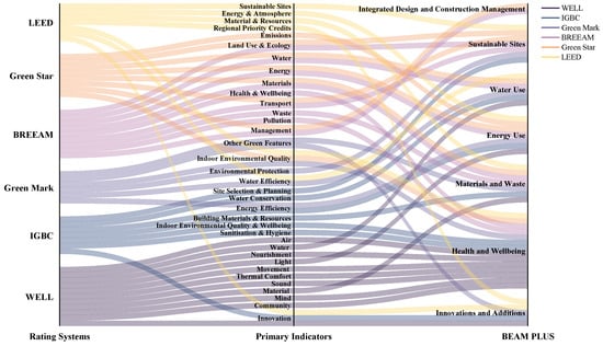 The BEAM Plus rating system, as it currently stands in Hong Kong, is structured around six core aspects that form the foundation of its assessment criteria. These include Integrated Design and Construction Management (IDCM), Sustainable Sites (SS), Materials and Waste (MW), Energy Use (EU), Water Use (WU), and Health and Wellbeing (HWB) []. Additionally, the framework incorporates a ‘bonus’ category focused on Improvement and Innovation, aimed at incentivizing the adoption of established innovative technologies. To enhance the evaluation framework for healthcare buildings within the existing BEAM Plus standard in Hong Kong, the study integrates secondary criteria from six globally recognized sustainability benchmarks: LEED HC, BREEAM HC, Green Star HC, Green Mark HC, IGBC HC, and WELL. This integration aims to enrich the BEAM Plus standards with a broader range of sustainability indicators, ensuring a more comprehensive and tailored approach to evaluating healthcare facilities. By integrating these diverse criteria, the framework expands its scope to effectively address the unique environmental and health-related challenges inherent in healthcare building design. The integration of various sustainability benchmarks into the BEAM Plus framework is clearly depicted using Sankey diagrams, facilitating a thorough assessment approach. Figure 6 offers a comparison of LEED HC, BREEAM HC, Green Star HC, Green Mark HC, IGBC HC, and WELL indicators, now reinterpreted within the BEAM Plus standards. This comparison effectively illustrates how these diverse criteria harmonize within the broader context of healthcare building sustainability in Hong Kong.
