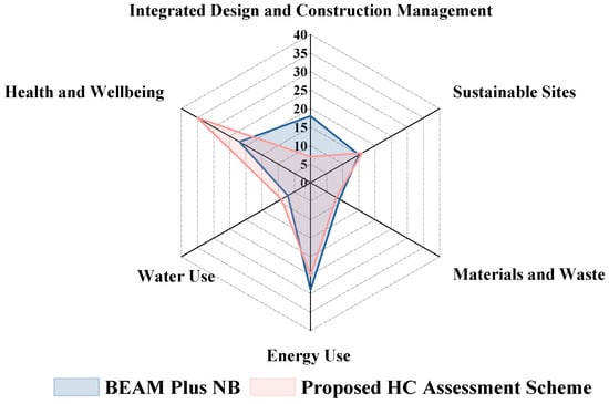 To bridge this gap, the proposed assessment framework for healthcare buildings is benchmarked against the prevailing BEAM Plus standard for New Buildings, while also integrating considerations from internationally recognized healthcare-specific benchmarks: LEED HC, BREEAM HC, Green Star HC, Green Mark HC, IGBC HC, and WELL. This integrative approach consolidates the insights and criteria from these leading sustainability benchmarks into the BEAM Plus framework, aiming to create a more robust and healthcare-focused assessment tool. An analytical comparison of this proposed healthcare assessment scheme with the conventional BEAM Plus standard for New Buildings is graphically represented in Figure 7.
