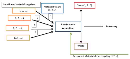 The amount of the supply of material i (tons) = the amount of virgin material i supplied from all the suppliers (j) + the amount of recovered material i that was acquired.