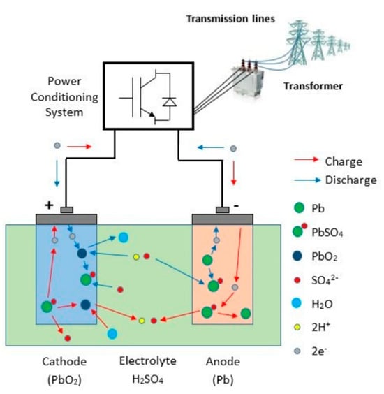 Lead–acid batteries: Lead–acid batteries are composed of lead alloys in combination with other additives, such as antimony, calcium, tin, and selenium. The cathode is made of lead peroxide on a lead lattice, and the anode is made of a lead sponge on a lead lattice, while the electrolyte is a solution of sulfuric acid (H2O + H2SO4). The schematic representation of a lead–acid battery can be seen in Figure 3. In the charged state, the positive active material is porous PbO2, while the negative active material is highly porous Pb. In the discharged state, both electrodes are made of PbSO4 [39]. The electrolyte in these types of batteries is an aqueous H2SO4 solution [40].