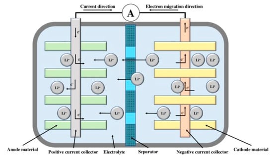 Lithium-ion batteries: Li-ion batteries are composed of three main components: the negative electrode (anode), a non-aqueous liquid electrolyte, and the positive electrode (cathode). The negative electrode is based on carbon and can be made of graphite or hard carbon, while the positive electrode contains lithium and a host material. Common positive electrode materials are lithium-containing transition-metal oxides, where the metal is Co, Ni, Fe, or Mn. The electrolyte in lithium-ion batteries is a lithium salt dissolved in an organic solvent (see Figure 4). There are many different types of lithium-ion batteries [41]. However, for this study, two types of lithium-ion batteries, “NMC” (using nickel–manganese–cobalt as the cathode material) and “LFP” (using lithium iron phosphate as the cathode material), have been used [40].