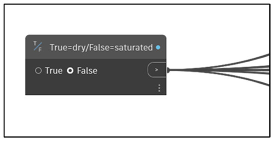 The “Thermal conductivity” and “Density” nodes provide the property values under both dry and saturated conditions, as indicated in Table 1 and Table 2. The “If” node automatically switches the thermal conductivity and density values between dry and saturated conditions. In this research, “true” represents dry conditions and “false” represents saturated conditions (Figure 1). For example, in the case of perlite, when the water condition is set to dry, the thermal conductivity is 0.076 W/mK and the density is 164.2 kg/m3. Conversely, when the water condition is set to saturated, the thermal conductivity becomes 0.312 W/mK and the density changes to 510.5 kg/m3 (Figure 2). Figure 3 depicts the Dynamo workflow for creating the perlite drainage material.