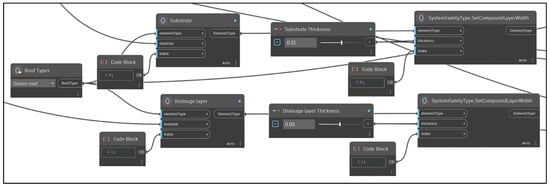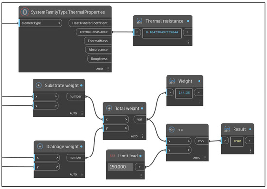 Finally, Figure 6 illustrates the workflow employed to evaluate the thermal and structural characteristics of green roofs. In terms of thermal performance, the thermal resistance was a key factor considered. This property was automatically measured by Revit and imported into Dynamo, considering the thermal conductivities of the various substrate and drainage materials, which are influenced by the water content conditions (dry or saturated), as well as the material thicknesses.