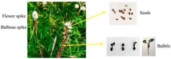 | Treatments | Length of the Flower Spike(cm) | Proportion of Flower Spike Length per Plant (%) | Length of Bulbous Spike (cm) | Proportion of Bulbils Spike Length per Plant (%) | Number of Flowers | Proportion of Flower Number per Plant (%) | Number of Bulbils | Proportion of Bulbil Number per Plant (%) | Flower Size (mg) | Bulbil Size (mg) |