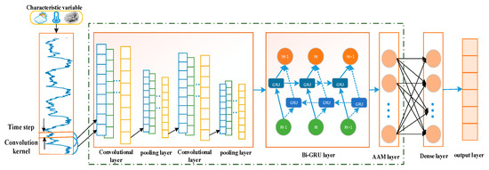 Combining a CNN, BiGRU, and AAM, a CNN-BiGRU-AAM hybrid deep neural network was constructed, as shown in Figure 3.