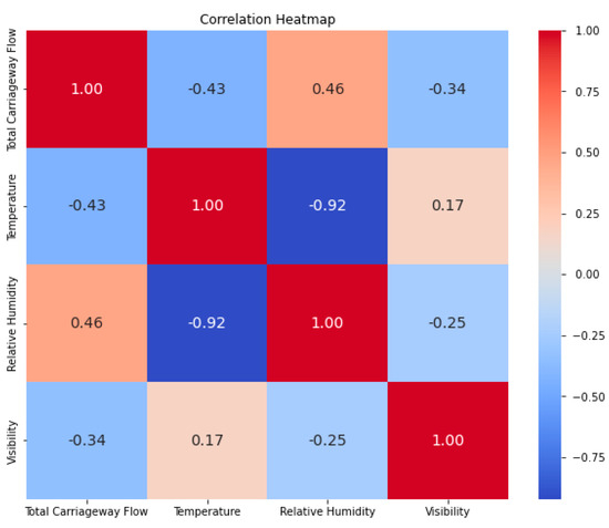 Step 3: Data feature correlation analysis. In order to study the relationship between variables affecting urban traffic flow and weather, we collected quantifiable numerical weather data such as temperature, relative humidity, and visibility. Through descriptive statistical analysis and correlation heatmaps, as shown in Figure 4 we were able to discern the underlying association between weather factors and short-term traffic flow, enabling us to ascertain the extent to which weather features impact traffic volume. This analysis provides a solid foundation for developing prediction models that incorporate weather features.