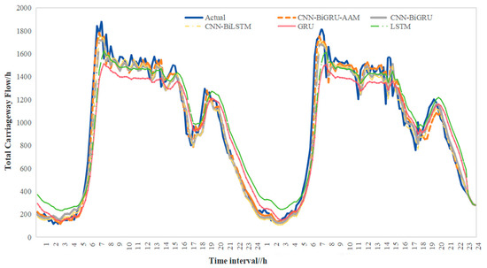These results indicate that the proposed CNN-BiGRU-AAM combination predictive model performs remarkably well in accurately predicting short-term traffic flow, closely approximating actual values. Therefore, drawing upon the spatiotemporal features of traffic flow, utilizing the CNN-BiGRU predictive model with an additive attention mechanism for short-term traffic flow prediction is feasible.